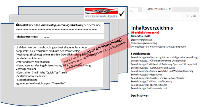 Dies ist aber sehr stark zu bezweifeln, sollten Voranschlag und Rechnungsabschluss nur in der von den Pilotgemeinden (Grafenwörth, Trofaiach und Klagenfurt) vorgelegten Form ("Mindestausführung") präsentiert werden.